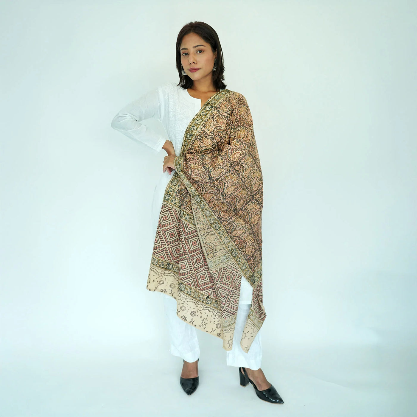 Each motif is a delicate imprint of cultural heritage, from florals to mythological symbols — beautifully arranged in earthy tones. Whether styled with a kurta, saree, or Indo-western outfit, this versatile piece adds a touch of heritage charm to any ensemble.