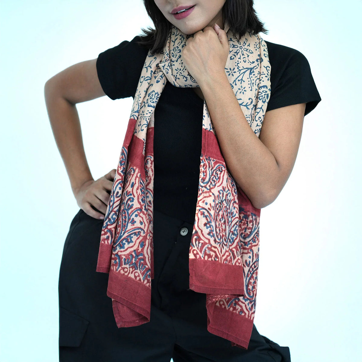 Step into the world of heritage artistry with the Indian Scarves Women's Kalamkari Cotton Stole, a hand block printed masterpiece from the renowned artisan village of Pedana (Machilipatnam, Andhra Pradesh). Every motif on this dupatta tells a story — inspired by ancient Kalamkari paintings and meticulously stamped using time-honored wooden block techniques.