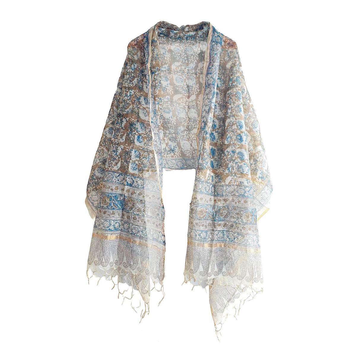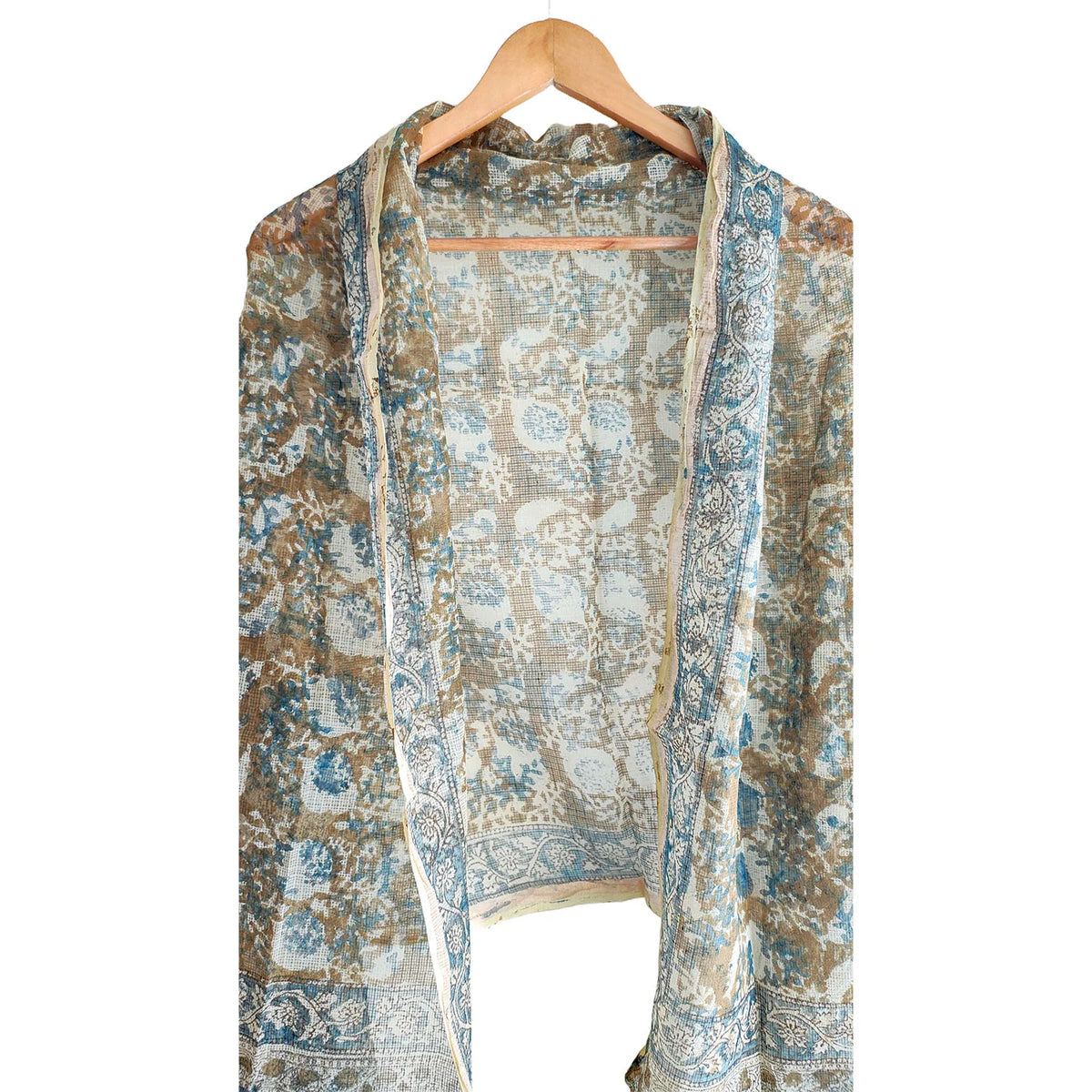 Crafted from a soft cotton-silk blend and finished with a touch of metallic sheen, it drapes effortlessly — ideal for daytime outings, festive gatherings, or even elegant workwear. Each dupatta is hand block printed using time-honored Bagru techniques, making every piece uniquely charming.