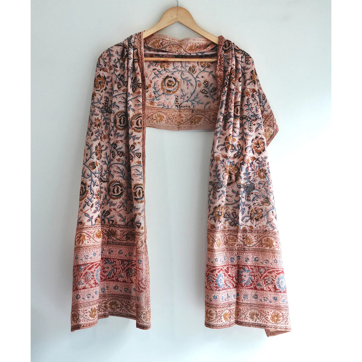 Elevate your wardrobe with the Indian Scarves Women's Kalamkari Cotton Stole, a celebration of India's age-old textile traditions and mindful craftsmanship. Hand block printed by skilled artisans from Pedana (Machilipatnam, Andhra Pradesh), this dupatta embodies the legacy of authentic Kalamkari art — where each motif is manually stamped using intricately carved wooden blocks.